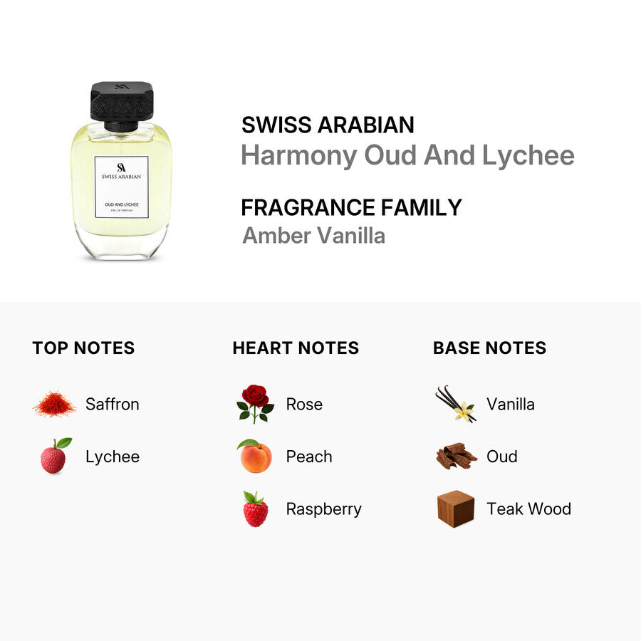 Descopera Swiss Arabian Oud and Lychee, o apa de parfum (Eau de Parfum) unisex cu un caracter oriental-modern si o prezenta eleganta. Aroma este construita pentru a impresiona prin profunzime si persistenta, fiind potrivita atat pentru zi, cat si pentru seara.